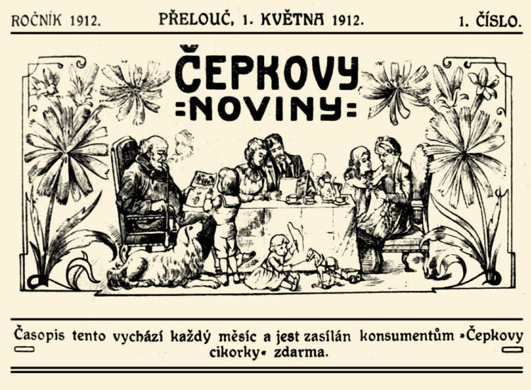 Čepkovy noviny 6.8.2025 Ve východočeské Přelouči vycházelo v letech 1912-1914 velmi zajímavé firemní periodikum – Čepkovy noviny. V tomto článku se pokusíme o jeho analýzu. Úvodem však musíme stručně představit jejich vydavatele. Čepkova továrna na sušení čekanky [1] byla založena roku 1893 Ing. Ferdinandem Čepkem (1867-1936). Nacházela se v podstatě naproti budově vlakového nádraží v místech dnešního čp. 403. Roku 1902 byl závod rozšířen na výrobu kávových náhražek z cikorky, podnik se tehdy jmenoval „Reform“ [2]. Podnikání se Čepkovi celkem dařilo – rozšířil objekt o skladiště a obytný dům čp. 403 (dnes již fyzicky neexistuje a nahradila ho pozdější novostavba), dále měl parní pilu a prodával stavební potřeby. Provoz pily ukončil roku 1904 [3]. V roce 1903 získal podnik dokonce zlatou medaili a diplom na průmyslové výstavě v Gentu v Belgii [4]. Roku 1914 se ale firma začala dostávat do problémů – nejprve vyhořelo skladiště [5] a asi v letech 1916-1920 byla továrna v majetku „Kolínské továrny na kávové náhražky“ [6]. Samotný Čepek v továrně figuroval do konce roku 1915 [7], znak města Přelouče byl ovšem na výrobcích i nadále. Další požár zasáhl areál roku 1919 [8] a zpracování cikorky zde bylo postupně ukončeno [9]. V roce 1922 pak byla v jejích místech dokončena budova čokoládovny EGO v novostavbě čp. 403, která se fyzicky dochovala dodnes. Ferdinand Čepek se stal v letech 1912-1914 vydavatelem velice pozoruhodného periodika, Čepkových novin (není přitom známo, že by v Přelouči tehdy nějaký jiný pravidelný tisk vycházel). Umožnil nám tak nahlédnout více do filozofie a chodu přeloučské cikorkárny, o které se jinak dochovalo velice málo informací. První číslo Čepkových novin vyšlo z podnětu majitele 1. května roku 1912. Čepek je založil u příležitosti desátého výročí zahájení výroby kávy z cikorky. Majitel továrny noviny v předmluvě věnoval hospodyňkám a konzumentům obecně, měl v plánu v nich otiskovat články zábavné i poučné. Tento cíl se mu zcela jistě povedlo naplnit. Noviny vycházely od 1. května 1912 do 1. července 1914. Rozděleny byly do dvou nepravidelných ročníků – první trval od května 1912 do května 1913, druhý pak do července 1914. Nejprve noviny vycházely jednou měsíčně, vždy k prvnímu dni měsíce. Konzumentům byly výtisky posílány zdarma a nebylo možné je předplatit. Vydavatelem byl Ferdinand Čepek, redaktorem Karel Picka [10] a tisk zajišťovaly Rolnické továrny v Praze. Od 1. prosince 1912 byla frekvence změněna na jedno dvojčíslo za dva měsíce a od května 1913 jedno dvojčíslo za tři měsíce, poslední dvě vyšla až po čtyřapůlměsíčních přestávkách. Kvůli zahájení první světové války spatřilo světlo světa poslední číslo 1. července 1914. Noviny měly formát A5, první ročník má ve svázané podobě dohromady 188 stran, druhý 92 stran. Jedno číslo mělo pak kolem dvaceti stran. Pro noviny bylo typické záhlaví první strany, které zobrazovalo rodinnou idylu u stolu – prarodiče, rodiče, tři děti, psa a na stole vonící konvici s kávou (viz obrázek). Okolo tohoto motivu je rostlinný dekor, celkové grafické ztvárnění novin je zřetelně pod vlivem secese. Čepkovy noviny šikovně kombinovaly reklamní a společenské směřování. Kromě různých básní, povídek a odborných článků v nich najdeme samozřejmě řadu textů různého druhu (sdělení konzumentům, básně, povídky či reklamy) propagující Čepkovy výrobky. Zásada byla vyrábět „nejlepší, bezvadné a přitom levné výrobky“ pod názvem Čepkova cikorka [11]. Po celou dobu promítá Čepek do provolání i vlastenecké city – chce, aby v domácnostech jeho cikorka předčila nečeské (tj. německé) výrobky, bojuje proti kartelům. Předností jeho čekanky je její prospěšnost zdraví a český původ. Snadno lze zjistit, že na jaře 1912 vyráběl Čepek žitnou kávu, pravou fíkovou kávu, zrnitou cikorku, čekankovou agrární cikorku, čekankovou cikorku v kulatém balení a jako specialitu kávu „Amant“ [12]. V březnu 1914 uvedli na trh kávu Karo a ovocnou kávu [13]. Na stránkách svého periodika Čepek dokonce rozvířil polemiku se svými konkurenty. V článku Našim P. T. příznivcům! píše, že Čepkova továrna byla v celém Rakousku jediný nekartelovaný český závod s kvalitní cikorkou. Je prý „trnem v oku“ cizácké kartelované soutěži, která se ho snaží poškozovat. Agrární strana Čepkovi proto propůjčila ochranou známku Oráč. Konkurence známku ale nečestně napodobila a Čepek proto prosil veřejnost o podporu [14]. Později byly publikovány dva otevřené dopisy ohledně sporu s Kolínskou akciovou továrnou, která Čepka pomlouvala ve svém časopise Kupec, za přeloučskou továrnu zde reaguje také ing. A. Bubeník [15]. Polemika pak pokračuje v číslech 1/1913 a 2/1913, podporu již vyjadřují v dopisech i konzumenti. V čísle 2/1913 čteme dokonce o Čepkově výpadu proti Franckově továrně Roka v Českých Budějovicích, který pokračuje i v čísle 3/1914. Pití kávy podporovaly i odborné články. Nejvíce (celkem pět) jich napsal dr. Schönenberger [16], týkají se významu ovoce pro zdraví, salátů, studených nápojů, umělých vyživovacích prostředků a škodlivosti alkoholu. Dva odborné texty o původu a rozšíření čekanky zde publikoval samotný Ferdinand Čepek [17] a po jednom článku má prof. Vojtěch Černý z Kolína (o významu spoření), doc. D. Panýrek [18] (o cikorce) a autor, který se podepsal iniciálou F. P. (taktéž ekonomické téma). Několik článků je bez uvedení autora (ovocný ocet, med, masité konzervy, kouření, ekonomika a lékařství). V novinách lze nalézt i různ