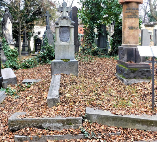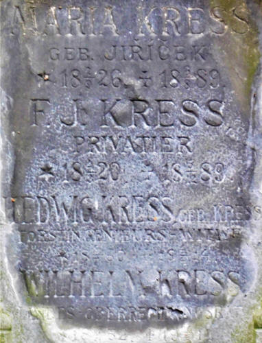 Wilhelm KRESS (* 17. 9. 1852, † 24. 5. 1917 Praha), účetní a majitel fimy Pražská firma Kress vybudovala již po smrti zde pohřbeného Wilhelma v letech 1925-29 první část vodárny v Podolí. Wilhelm Kress začínal jako účetní, vypracoval se ale až do pozice vrchního účetního rady a majitele vlastní firmy. Je možné, že byl v příbuzenském vztahu se stejnojmenným rakouským leteckým průkopníkem a konstruktérem Wilhelmem Kressem (* 29. 7. 1836 Sankt Petersburg, † 24. 2. 1913 Vídeň). - V roce 1949 na Správě hřbitovů evidovali žádost o odstranění německého nápisu. Nyní je však opět v původním stavu. (hrob V-12-43) |