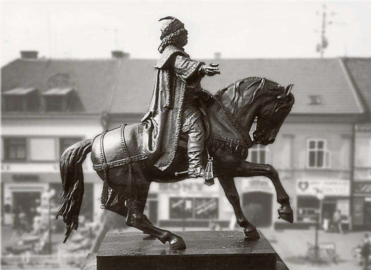 Socha Jiříka z Poděbrad 4.8.1896 na cestě ze Sadské do Poděbrad na fotografii amatéra p. Fr. Webra v Sadské