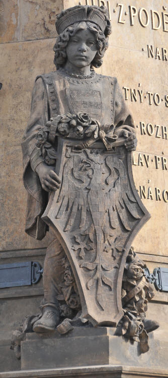 Podstavec sochy s pážaty zemí koruny české Čechy a Morava a znakem Poděbrad