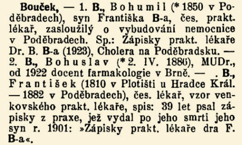 Poděbrady Medicína v době Boučkova nástupu do praxe procházela značným vývojem. Bylo to období výzkumů Louise Pasteura 188 a rozvoji bakteriologie, která přinesla zásadní pokrok ve vnitřním lékařství, chirurgii i gynekologii. Dále se díky bakteriologickým poznatkům velmi zdokonalila operativní chirurgie a začala se formovat také neurologie a psychiatrie pod vlivem Jeana-Martina Charcota 189. Výrazného pokroku dosáhlo i zubní lékařství spolu s ústní chirurgií, a to především zásluhou amerických odborníků. Jednalo se o období, kdy bylo lidstvo zcela, nebo alespoň částečně, zbaveno některých zhoubných nemocí a další výzkumy pokračovaly.190 Další nemalý přínos v druhé polovině 19. století přinesla institucionalizace veřejného zdravotnictví. Jednalo se především o vznik hygienických ústavů, dozoru ve zdravotnictví, ale také o nemocenské a úrazové pokladny, které zajišťovaly pojištění. Koncem 19. století byla navíc založena lékařská komora. S rozvojem lékařské vědy se pojilo i zlepšení společenského postavení lékařů, které do té doby nebylo příliš záviděníhodné. Mnohá křivda společností nanesená dosud odčiněna není, vyjádřil se k této problematice Bouček ve svých zápiscích. S vzestupem společenského postavení pojilo se i postavení hmotné, jelikož obyvatelstvo bohatlo. Dříve lékaři léčili třeba polovinu svých pacientů zdarma a druhou polovinu za směšný příspěvek. Konec této charitativní činnosti se pojil i se vznikem zmíněných lékařských institucí a dohlížejících organizací. V době Boučkova nástupu působilo v okolí Poděbrad stále velmi málo lékařských pracovníků. Po smrti jeho otce spočívala téměř veškerá činnost na něm. Až roku 1892 nastoupil do služby jako druhý praktický lékař poděbradské oblasti Jakub Vondrovic, což bylo pro Boučka nemalou pomocí. Zdejší nemocnice, založená Františkem Boučkem, však nedisponovala rozsáhlou kapacitou ani moderním vybavením, což limitovalo rozsah poskytované péče. Nejbližší veřejná nemocnice pro místní obyvatele byla v Kolíně a v roce 1890 vznikly další v Městci Králové a v Nymburce. Na počátku 80. let působil Bouček jako zástupce lékaře v Čáslavi. V celém okolí totiž vypukly pravé neštovice. Letní měsíce byly pro léčbu příznivější, jelikož nakažení mohli údajně zůstávat na lůžkách venku, ale v zimě jich muselo několik ležet pohromadě v dusných světnicích, což jim samozřejmě neprospívalo. Bouček pozoroval, že s neštovicemi se objevoval také záškrt. Pozoruhodné bylo, že se tato nemoc téměř vůbec neobjevovala u dospělých, jako například v tehdejším Německu, kde ukončila život nemalému množství obyvatel. Vyskytovala se zde především u dětí a polovina z nich této nemoci podlehla. Jak už bylo uvedeno výše, zpočátku své poděbradské praxe ordinoval Bouček společně se svým otcem Františkem. Zúčastnil se také proslulé operace odstranění vaječníků dr. Weissem. O rok později již sám provedl úspěšný chirurgický zákrok k odstranění močového kamene u sedmiletého chlapce. I tento zákrok byl v té době považován za vrchol lékařské dovednosti. 191 Od roku 1890 byl po otcově odchodu do penze jmenován obvodním lékařem sám. 192 Mezi další epidemie, se kterými se Bouček v počátcích svého působení v Poděbradech setkal, patřil střevní tyf, který zamořil téměř celou obec Opolany, spála, která v Sánech zahubila velké množství dětí, spalničky nebo zánět plic, na který v roce 1894 zemřelo přibližně padesát dětí. Na druhou stranu střídavka, úplavice nebo kurděje, jimiž trpělo obyvatelstvo za časů ordinování Františka Boučka, již vymizely. Pouze chřipka, která v okolí Poděbrad nebyla od 30. let, se znovu objevila v roce 1890 a od té doby propukla její lehká forma vždy v zimních měsících. 193 Lékařská praxe však přinesla i několik pozoruhodných případů. Jedním z nich byl muž se vzteklinou, který cestou z Chlumce do Prahy vyskočil v Poděbradech z vlaku a následně v nemocnici zemřel. Bouček se setkal v praxi ještě se dvěma případy vztekliny, kdy byl chlapec i žena pokousáni psem. Ani jeden z nich nemoc nepřežil. Jednou také vyndával kleštěmi zubní protézu, která se pacientovi zasekla v jícnu těsně za hrtanem. Zajímavý byl také jeho způsob léčení pacientů, kteří vykašlávali krev. Podával jim totiž hlavěnku dávivou ve větším množství. V tomto způsobu léčby se pravděpodobně inspiroval od soudobého francouzského doktora George Phillipa Trousseaua. Bouček však ne vždy během léčby využíval ty nejmodernější postupy. Ku příkladu zmiňovaný tyf totiž úspěšně léčil pouze častým měněním jak ložního, tak osobního prádla a čerstvým vzduchem bez jakékoliv medicíny. 194 Neobvyklými případy byla provázena Boučkova praxe i v pozdějších letech. V roce 1902 byl svědkem toho, jak pacientce během zvracení vyšla z úst tasemnice. Bouček uvedl, že nic podobného ještě za svou praxi neviděl. Poslední den roku 1902 absolvoval Bouček porod dvojčat. Jednalo se tehdy o velmi chudou rodičku, která v prochladlé světnici neměla ani postel a ležela pouze na několika bednách. Nebylo ani do čeho děti obléct, proto šla babička prosit sousedy o nějaké prádlo a peřiny. I v takto nepříznivých podmínkách si musel Bouček poradit a vždy se snažil svým pacientům pomoci, jak nejlépe uměl, nehledě na jejich finanční situaci. Hlaste, babičko, při křtu, že se narodili až po půlnoci, hoši přijdou o rok později k odvodu. 195 Rodička i přes nepříznivé podmínky přežila. Během své lékařské praxe se dr. Bouček nesetkával pouze s čistě medicínskými otázkami, a