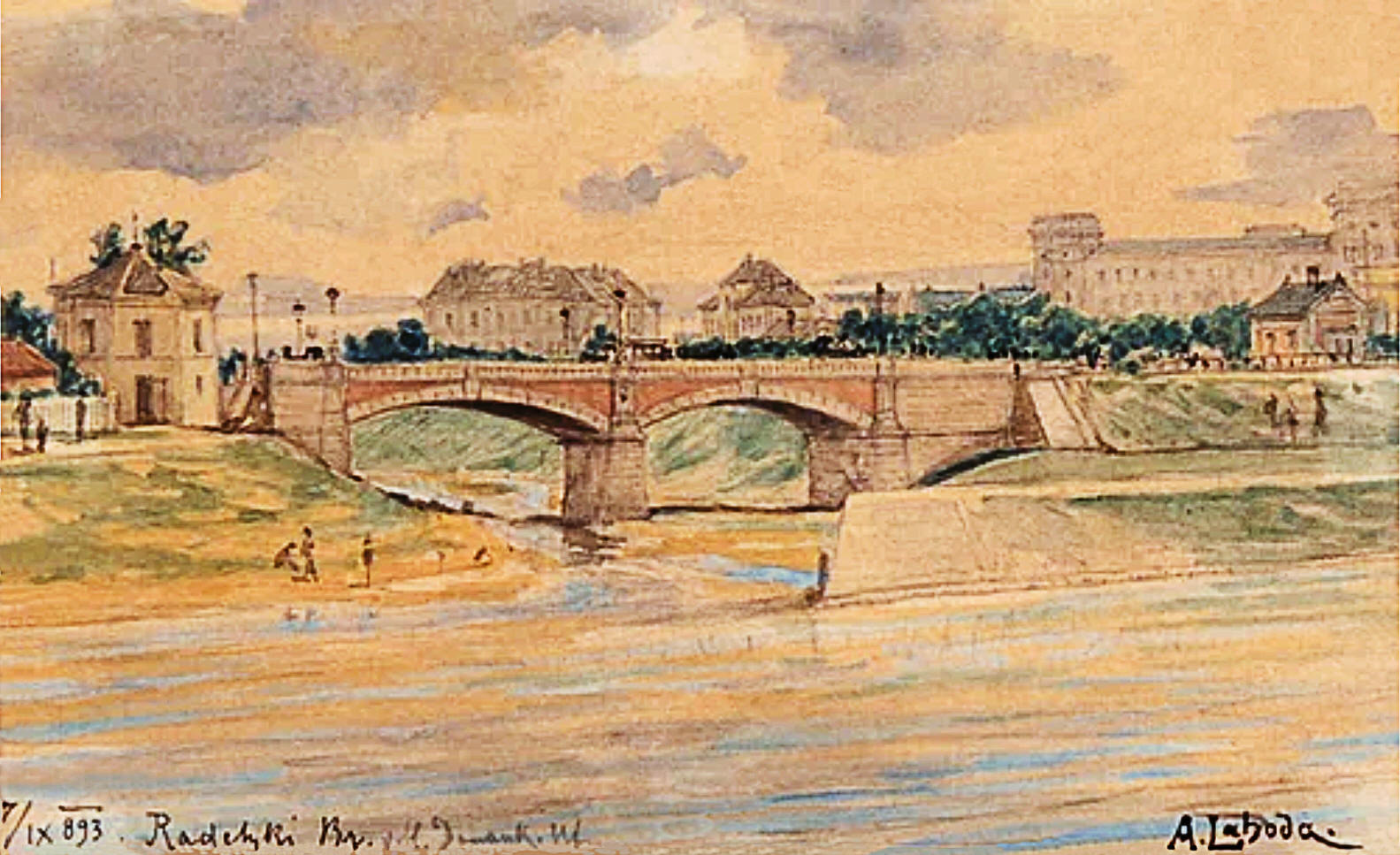 Radeckého most ve Vídni 1893 Dřevěný Weißgerberův postavený před rokem 1848, byl v roce 1851 poškozen povodní a nahrazen provizorním mostem. V letech 1854/1855 byl postaven kamenný obloukový most navržený J. H. Mackem. V roce 1869 byl pojmenován po hraběti Josephu Wenzelovi Radeckém. V letech 1899/1900 byl v rámci regulace řeky Vídeň kamenný most nahrazen železným mostem. |