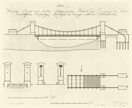 První silniční řetězový most na evropském kontinentu byl předán silničnímu provozu dne 8. června 1824 ve Strážnici blízko zámku. Měl rozpětí 29,7 m. Řetězy pocházely z Vorderbergu v Rakousku, závěsné tyče a vodorovné nosníky z Blanska (obr. 1). Most navrhl a jeho stavbu řídil inženýr Bedřich Schnirch (* 2. 12. 1791 † 25. 11. 1868). Konstrukce se napřed nechovala zcela podle projektantových předpokladů. Po odstranění podpůrného lešení se řetězy posunuly v ložiscích na pylonech asi o 40 mm ke středu řeky a most se poněkud prověsil; způsobilo to buď naklonění kotevních bloků nebo napřímení řetězů v jejich zdivu. Schnirch vadu napravil tím, že celou železnou konstrukci rozebral, potřeboval na to tři dny a s úspěchem obnovil vodorovný průběh mostovky asi tím, že podložil podpory řetězů na pylonech. Zatěžovací zkouška četou jízdního vojska pak proběhla úspěšně a most se používal z počátku hlavně pro dopravu stavebnin při úpravách strážnického zámku a jeho okolí. Sloužil provozu až do regulace toku v r. 1857.