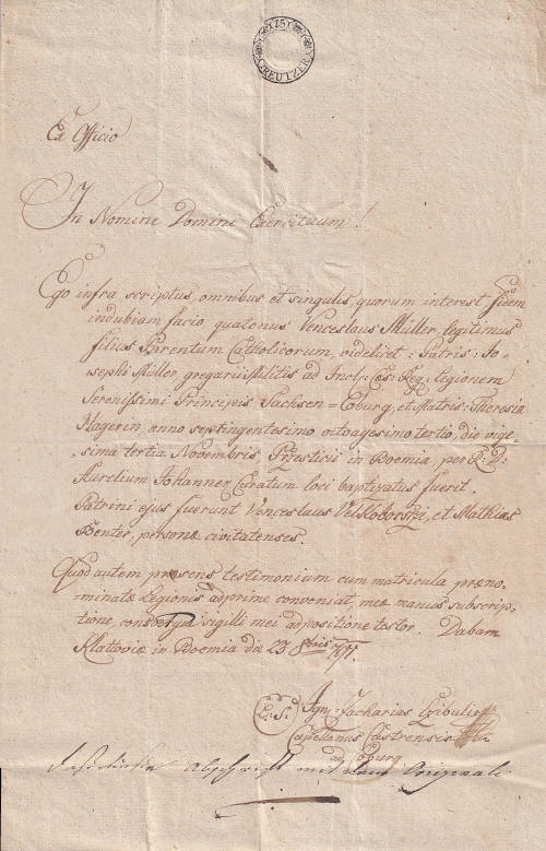 Ex officio In nomine Domini Exercituum ! Ego infra scriptus omnibus et singutis quorum interest fidem indubiam quatenus Venceslaus Müller legitimus filius Parentum Catholicorum videlicet: Patris Josephi Müller gregarii Militis ad Inos: Cas. Reg. Legionem Serenissimi Principis Sachsen-Coburg et matris Theresia Hagekin anno septingentesimo ortoagensimo tertio die vigesima tertia Novembris Przesticii in Bohemia per R. D. Aurelium Johannes Curatum loci baptizatus fuerit. Patrini eius fuerunt Vencelaus Velkoborski et Mathias Ssenter persona civitatenses. Quod autem praesens testimonium cum matricula pranominate Legionis adprime conveniat meo manus subscriptione consvertue sigilli mei ad positione testor. Dabam Klattovia in Bohemia die 23.octobris 1791