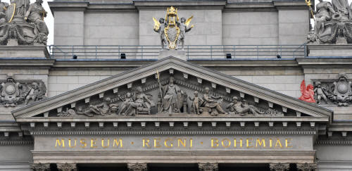 Čtvero mohutných sousoší na hlavní kopuli - Nadšení vlastenecké, které odumírající národ náš k novému životu vzkřísilo a které od prvopočátku obráželo se v zřízení »musea«. Obětavost, bez níž by nadšení nebylo dosáhlo těch výsledků, k nimž dospělo. Láska k minulosti, z níž linulo historické a literární probuzení, a Láska k pravdě, která nejen vede k vědeckému badání, nýbrž k poznání pravých cílů života. Každé sousoší má trojiční charakter, jeden hlavní motiv v podobě okřídleného alegorického genia a dvou dalších postav s vedlejšími atributy. Jednou z nejvýraznějších sochařských osobností, která se uplatnila při dotváření centrální partie muzejní budovy, byl Bohuslav Schnirch, přední pražský sochař. Jeho umělecký názor dokonale souzněl s konceptem novorenesanční architektury a podobně jako u divadelní budovy i tady úspěšně vyřešil završení pylonů, jež opticky vznikly ve středním rizalitu představením sloupového portiku a nasazením kupole. Právě ke zjemnění přechodu mezi jejím vertikálním tělesem a markantní horizontálou střešní atiky přispěly jeho čtyři velkorysé alegorické skupiny ctností umožňujících významné kulturní činy těch, jimž je vyhrazen čestný prostor Pantheonu. V analogicky pyramidální kompozici, již křídla ženských géniů otevírají do prostoru, a s arzenálem klasických atributů a personifikací představují vpředu Obětavost a Nadšení, vzadu pak Lásku k minulosti a Lásku k pravdě. V konkursu na sochy symbolizující síly, které stály za myšlenkou zřídit Museum, zvítězil Schnirch před Antonínem Wagnerem a Antonínem Poppem. Myslbek se nezúčastnil. |