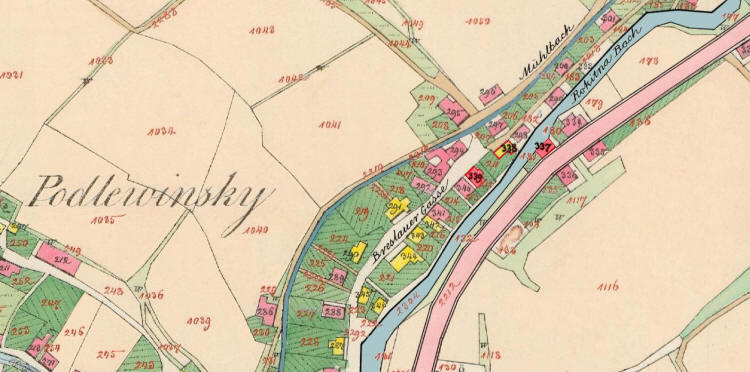 červeně je vyznačena přibližná poloha domů bratří Votočků