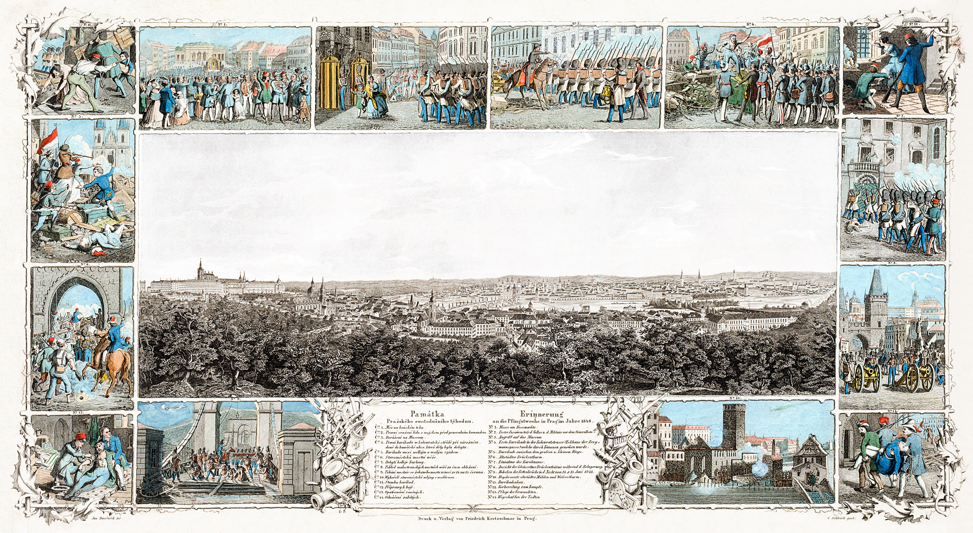 Prwní barikada w kolowratské střídě při nárožním domě do hawířské ulice, která děly byla dobyta. |