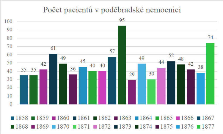 Počet pacientů poděbradské nemocnice mezi lety 1858-1877. 78 V období od roku 1857 do konce roku 1877, tedy během prvních 20 let, bylo v poděbradské nemocnici léčeno celkem 891 pacientů, z nichž se 713 uzdravilo a 178 zemřelo. Nejčastěji se jednalo o chirurgické případy, zejména zlomeniny kostí, kterých bylo zaznamenáno 159, přičemž 156 nemocných se uzdravilo a tři zemřeli. Kromě toho zde byli operováni pacienti s kýlami, poškozením končetin či jinými vážnými stavy. 79 Mezi nejrozšířenější nemoci patřil tyf, spalničky, malárie, spála nebo neštovice. Pacienti často trpěli močovými kameny. Pozoruhodný je nárůst nemocných v roce 1861. Vyskytlo se mnoho pacientů nakažených malárií a úplavicí, přičemž některé případy v okolních obcích končily smrtelně. Následující rok Bouček formuloval zásadní poznatek o nakažlivé povaze tuberkulózy, když sledoval její postupné šíření mezi členy jedné rodiny. Jeho pozorování tak předznamenalo závěry, které byly vědecky potvrzeny až o dvě desetiletí později. 80 Roku 1866 vypukla další epidemie cholery, v pořadí pátá během 19. století. Trvala přes dva měsíce a vyžádala si celkem 212 nemocných, z čehož 115 pacientů podlehlo. 81 Pouze 9 z nich však bylo hospitalizováno v nemocnici, proto jsou hodnoty v daném roce nižší. Bouček se postupně přesvědčil, že infekce často souvisí s konkrétními místnostmi nebo lokálními podmínkami. Zakazoval tedy pobyt, a především spánek, v infikované světnici, což vedlo k úmrtím těch, kteří zákaz ignorovali. K výraznému nárůstu pacientů došlo v roce 1868. Pozoruhodné ovšem je, že neprobíhala žádná rozsáhlá epidemie, pouze již zmiňované nemoci s lehkým průběhem. Zemřely však tři ženy po porodu na infekční potíže. Bouček tehdy zjistil, že nemoc rozšiřovala porodní bába, zatímco jiné ženy obsluhované jinými bábami zůstaly zdravé. 82 Bouček veškeré své poznatky k tomuto případu publikoval následující rok v Časopisu lékařů českých, 83 což samozřejmě přineslo reakci dalších odborníků, kteří jeho názory nesdíleli a hledali příčiny někde jinde. 84 Bylo však značné množství pacientů se zlomeninami. Je možné, že vzhledem k absenci rozsáhlejších epidemií a vážných případů se v daném roce podařilo v nemocnici ošetřit větší počet pacientů. Zároveň nemocnice obdržela významnou finanční podporu čítající 2000 zlatých z pozůstalosti po měšťanovi Albertu Klofcovi a dalších 900 zlatých prostřednictvím nadace Karla Kryšpína, poděbradského rodáka, který téhož roku zemřel. Jen v roce 1877 bylo ošetřeno 74 nemocných, z toho deset zemřelo. Bylo evidováno 14 případů zlomenin a provedeno sedm větších operací. Všichni operovaní, s výjimkou jediné ženy, která trpěla kýlou, se uzdravili. Pro svůj význam byla nemocnice v následujícím roce rozšířena. 85 Vysoký nárůst pacientů byl zapříčiněn epidemií spály. Toho roku se navíc poprvé objevil dosud neznámý záškrt, který se bleskově šířil do všech okolních obcí. Pacienti trpěli bolestí v krku, obtížným polykáním a selháváním srdce, přičemž většina případů končila během několika dnů smrtí. Bouček tehdy čelil náročné situaci, kdy si s léčbou daného onemocnění nevěděl rady. Léčebné postupy nedokázaly zabránit opakovanému vytváření výpotků – jakmile byl jeden odstraněn, brzy se objevil další. Z jeho pozorování navíc vyplynulo, že nemoc měla nejzávažnější průběh zejména u dětských pacientů. 86 Bouček zůstával i přes značný počet nemocničních pacientů nadále zapáleným praktickým lékařem. Počet léčených osob ve skutečnosti výrazně převyšoval hodnoty uvedené v přiloženém grafu, neboť ne všichni pacienti byli hospitalizováni. Je třeba mít na paměti, že tehdejší nemocniční zařízení nedisponovalo ani deseti lůžky, což významně omezovalo kapacitu pro lůžkovou péči. Nová nemocnice byla v každém případě Boučkovým hlavním působištěm a místem veřejné medicíny. Prováděl zde chirurgické operace, léčil zlomeniny a aktuální nemoci. Významným milníkem bylo pro tuto nemocnici provedení první úspěšné ovariotomie v české chirurgii roku 1878, 87 kterou vykonal doktor Vilém Weiss. 88 Ten zde operoval i nadále, konkrétně pacienty s močovými kameny. V 80. a 90. letech o těchto operacích vyprávěl svým studentům chirurgie v Praze, přičemž tvrdil, že se v Poděbradech vyskytují močové kameny mnohem častěji než v jiných krajích. 89 Následně zde bylo provedeno dalších 12 laparotomií, 90 z nichž 11 mělo příznivý výsledek. 91 Tyto významné události byly připomínány i na oslavách padesátiletého výročí otevření nemocnice, kterých se účastnila zmíněná pacientka, jež podstoupila první ovariotomii, a dva pacienti operovaní laparotomicky. 92 I přes veškeré úspěchy nebylo toto období pro doktora Bouček zcela jednoduché. Jeho působící okruh se neustále zvětšoval a on musel denně podnikat až osmdesátikilometrové cesty za svými pacienty. Často na něj čekaly povozy i před jeho domem, aby ho zastihly, když se vracel z práce, a opět ho odvezly. On však tuto službu nepopisoval jako příliš náročnou, spíše mu postupem času začal vadit pohled na neustále se dávící pacienty. 93 Členové jeho rodiny později vzpomínali, že před vznikem nemocnice často v letních měsících nechával Bouček některé pacienty se zlomeninami nebo jinými závažnými nemocemi v kryté části na své zahradě, aby měli lékařskou péči na blízku. Údajně také mnohokrát udivoval některé obyvatele tím, že dokázal přijet k případu dříve, než se stihl vrátit posel. 94 Nemocnice plnila sv