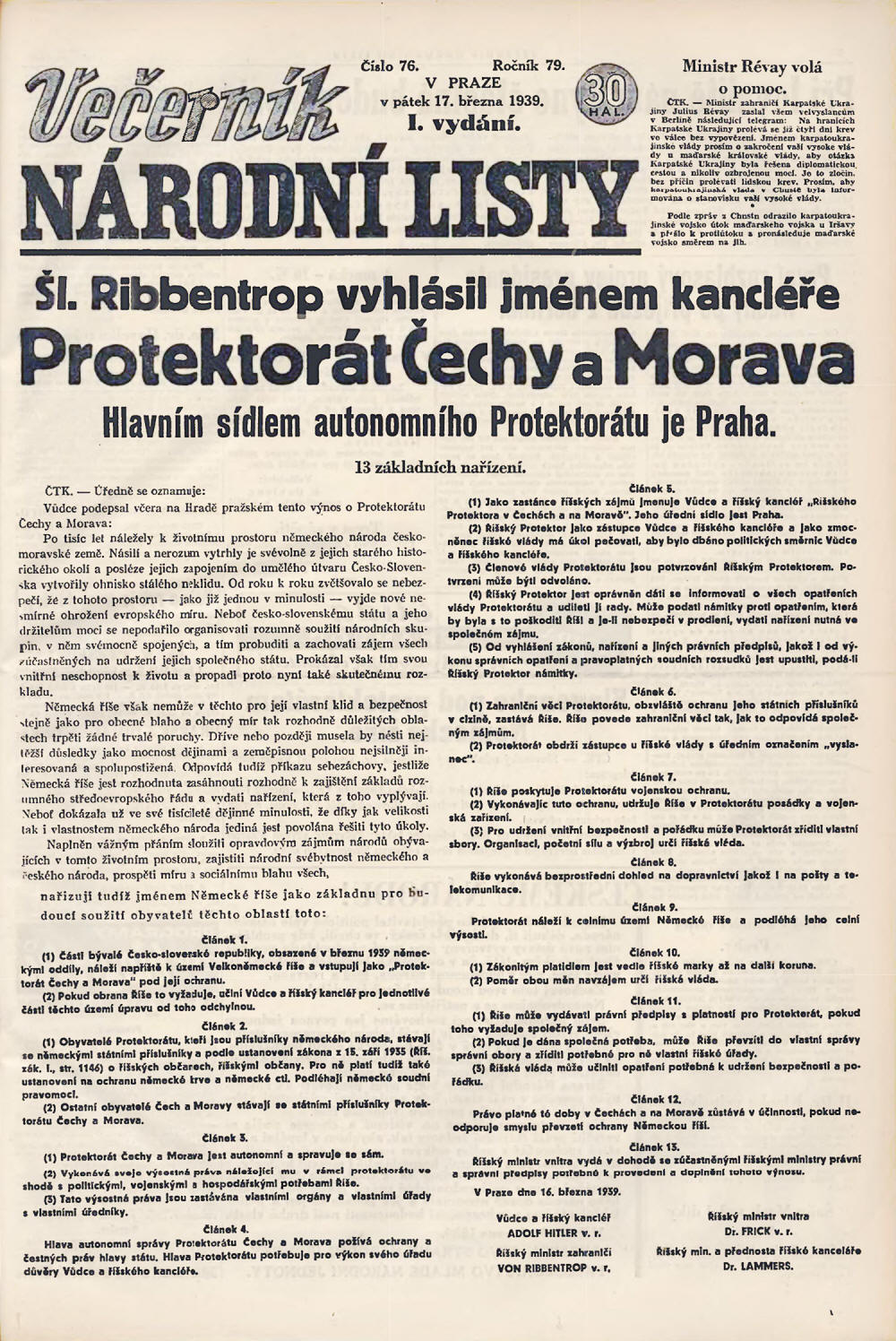 Jen několik hodin poté, co 14. března 1939 slovenský sněm odhlasoval
