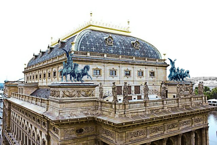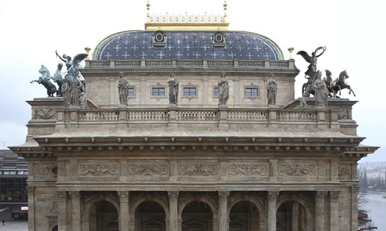 Sochař Bohuslav Schnirch dohotovil právě na levém křídle průčelí národního divadla model jedné ze svých překrásných trig. Model postaven tu na zkoušku, a jsa co do rozměrů přesně a pečlivě proveden a bronzován, činí dojem samého sousoší, kteréž zhotoveno z kovu později budovu národního divadla krášliti bude. Hledíme-li na model poněkud dále z nábřeží, nelze si představili celku více harmonického, kdežto ze železného mostu vadí nedostatek volného prostoru za Victorií a zvláště jejími křídly, která se téměř samé římsy dotýkají. V moci sochařově, aniž koho více, již arci není vadě této odpomoci. |