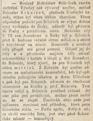 Výtečný náš výtvarný umělec, sochař Bohuslav Schnirch, předseda Umělecké besedy, stižen byl včera těžkou chorobou. Včera odpoledne podnikl pan Schnirch se svými dvěma syny vycházku do Šárky, odkudž byl převezen do Prahy v povážlivém stavu. Nedaleko vily č. 73 “na Jenerálce” u Šárky byl p. Schnirch před 8. hodinou večerní stižen mdlobou a sklesl v bezvědomí na silnici. Domovník z uvedené villy přispěl mu první pomocí. Odnesl jej do villy a s přivolením majitele villy odvezl ochuravělého v kočáře k lékaři p. dru. Strnadovi do Bubenče, který zjistil, že pan Schnirch byl stižen mrtvicí. Z Bubenče byl umělec odvezen na malostranské komisařství, kde byl opět ohledán policejním lékařem p. drem. Ullrichem a pak byl pan Schnirch odvezen do všeobecné nemocnice na kliniku p. prof. Maixnera. Tam teprve nabyl p. Schnirch poněkud vědomí. Ač stav jeho jest povážlivým, možno přece nadíti se, že se zlepší. Umělecká obec naše jeví upřímnou soustrast nad příhodou, která pana Schnircha stihla. – Podle zpráv, došlých nás ve chvíli uzavírky listu, jest stav páně Schnirchův takměř – beznadějný. |