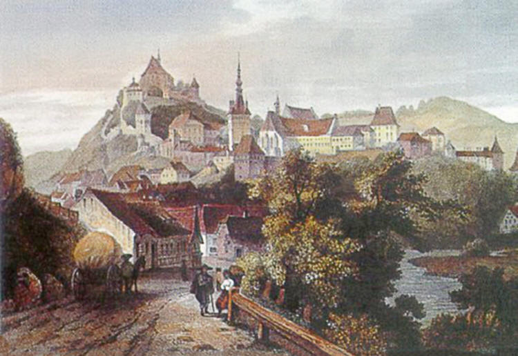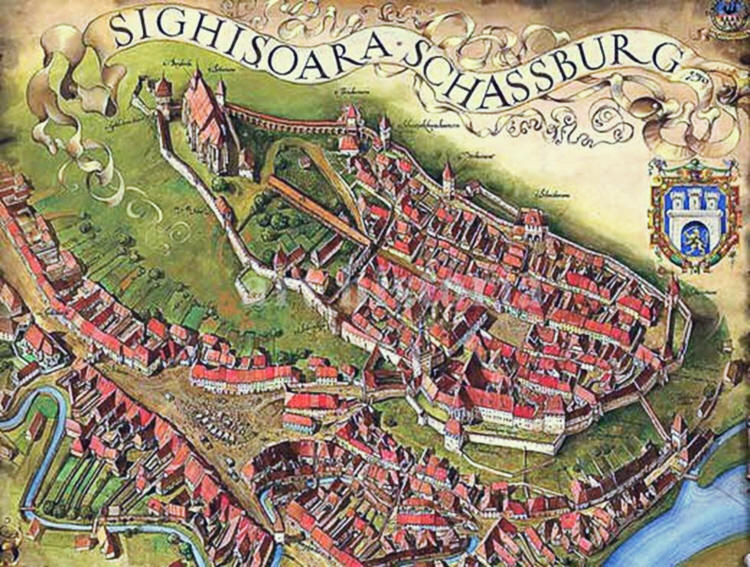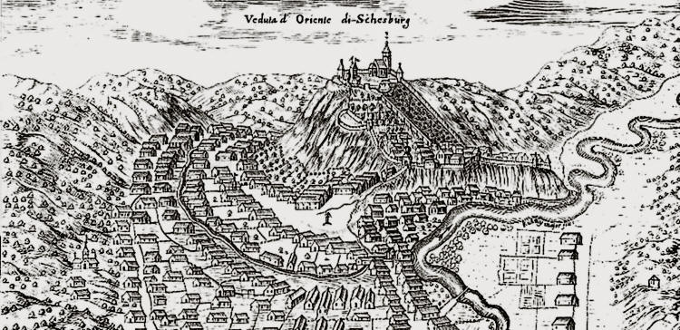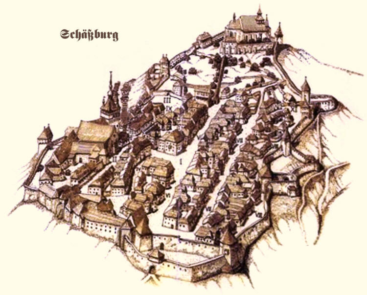 Latinsky se opevněné centrum nazývalo Castrum Sex, byla to šestá ze sedmi římských pevností (odtud Sedmihradsko). Pevnost se sedmi obrannými věžemi a 150 obytnými domy vybudovali němečtí osadníci kolem roku 1200. Předpokládá se, že vznikla rozšířením starší dřevěné pevnosti na vrchu Schulberg kolem roku 1191. Po tatarském vpádu v roce 1241 bylo opevnění doplněno o kamenné hradby, kapli a věž. Je obehnána 930 metrů dlouhými hradbami, které jsou místy vysoké až 15 metrů. Do hradeb bylo vestavěno dalších 14 věží, které spravovaly jednotlivé cechy, které reprezentovaly silnou místní řemeslnou tradici. (dochovalo se jich 9). V roce 1298 je zmiňován dominikánský klášter uvnitř opevněného komplexu. V podhradí se rozrůstalo osídlení, takže v roce 1367 získal Schäßburg statut města. . Ze Schäßburku pocházel hrabě Vlad Tepeš-Dracula (Vlad-Nabodávač), jeho palác se nacházel vlevo před věží na obrázku označeno IX. Přezdívku Drákula si vysloužil již otec Drákuly, Vlad I., jenž se pod vlajkou rytířského řádu Draka snažil bránit křesťany před nájezdy Turků. Později jako vládce Transylvánie nechal razit mince se znakem řádu Draka. Říkalo se mu proto Drac (= drak). Drákula neboli rumunsky Dracula by potom byl tvar znamenající „syn draka“. V rumunštině však slovo Drac má ještě jeden význam - ďábel. V případě Vlada II. Tepeše už šlo o přímou souvislost s jeho ďábelskými praktikami, jimiž likvidoval své protivníky. Tepeš totiž v rumunštině znamená „narážeč na kůl“. Vlad II., jenž třikrát ovládl vejvodství valašské, se oddával zvrácené podívané na muka ostatních. Nechával lidi narážet na kůl. Pomalu a v příšerných mukách umírali na kůlech napůl rozpáraní zločinci, ale i zajatci, prostí lidé či cizí vyslanci, kteří se nevypočitatelnému Drákulovi z nějakého důvodu znelíbili. |