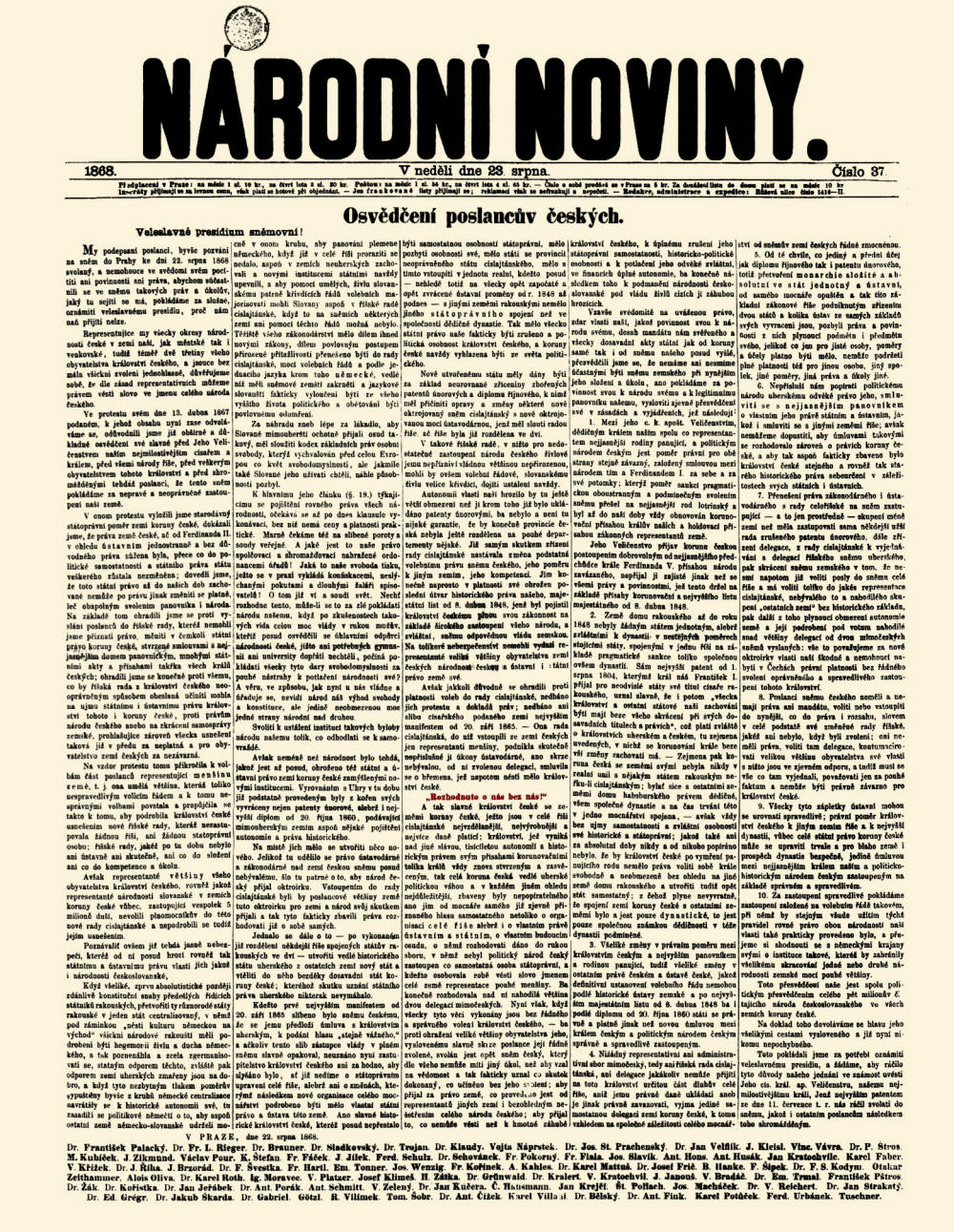 81 signatářů: František Palacký, František Ladislav Rieger, František August Brauner, Karel Sladkovský, Alois Pravoslav Trojan, Karel Leopold Klaudy, Vojtěch Náprstek, Josef Stanislav Práchenský, Jan Velflík, Jan Kleissl, Vincenc Vávra Haštalský, Jan Štros, Matěj Kubíček, Josef Zikmund, Václav Pour, Kristian Stefan, František Fáček, Jílek Jan, Ferdinand Schulz, Antonín Schovánek, Pokorný František, František Fiala, Slavík Josef, Antonín Hons, Antonín Husák, Jan Kratochvíle, Karel Faber, Václav Křížek, Josef Říha, Josef Brzorád, František Švestka, František Hartl, Emanuel Tonner, Josef Wenzig, František Bronislav Kořínek, Augustin Kahles, Karel Mattuš, Josef František Frič, Bedřich Hanke, Šípek František, Filip Stanislav Kodym, Antonín Otakar Zeithammer, Alois Oliva, Karel Roth, Ignác Moravec, Vilém Platzer, Klimeš Josef, Hynek Zátka, Vendelín Grünwald, František Kralert, Václav Kratochvíl, Jan Janouš, Vincenc Bradáč, Emanuel Trmal, František Pštross, Žák Jan, Karel Kořistka, Jeřábek Jan, Antonín Porák, Antonín Schmidt, Václav Zelený, Kučera Jan, Čeněk Hausmann, Jan Krejčí, Štěpán Pollach, Macháček Josef, Václav Reichert, Jan Strakatý, Eduard Grégr, Jakub Škarda, Josef Ambrož Gabriel, Josef Götzl, Vilímek Josef Richard, Tomáš Šobr, Antonín Čížek, Karel Drahotín Villani, Václav Bělský, Antonín Fink, Karel Potůček, Ferdinand Urbánek, Emanuel Tuschner |