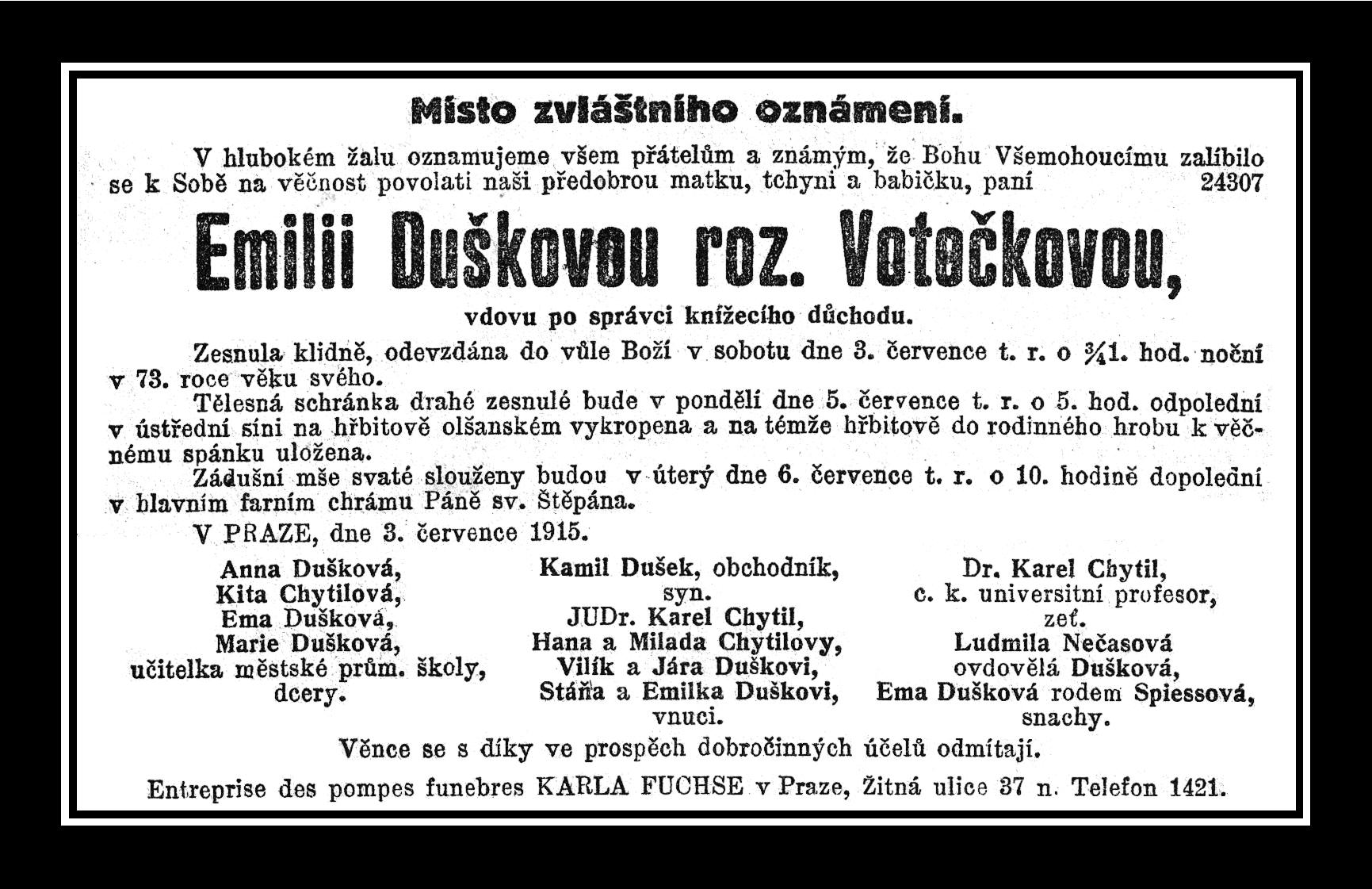 Anna Dušková * 25.2.1864 † ? nar. ve Vysokém Veselí Kateřina Dušková Chytilová * 30.10.1865 † ? Emilie Dušková * 5.2.1867 † ? nar. ve Vysokém Veselí Marie Dušková * 11.2.1870 † ? nar. ve Vysokém Veselí - učitelka městské průmyslové školy Kamil Dušek * 18.7.1873 † ? Lošice, Sošice - obchodník + Ema Spiessová Dušková Pavel Dušek * 18.7.1873 † ? ženatý Ludmila Dušková Nečasová |