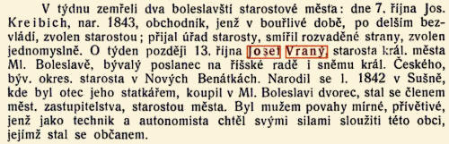 | Děti: | Božena Vraná Marečková * 20.7.1870 † 11.7.1948 JUDr. Bohuslav Vraný * 22.4.1873 † 8.1.1947 Zdenka Vraná * 7.7.1877 † 7.7.1887 |