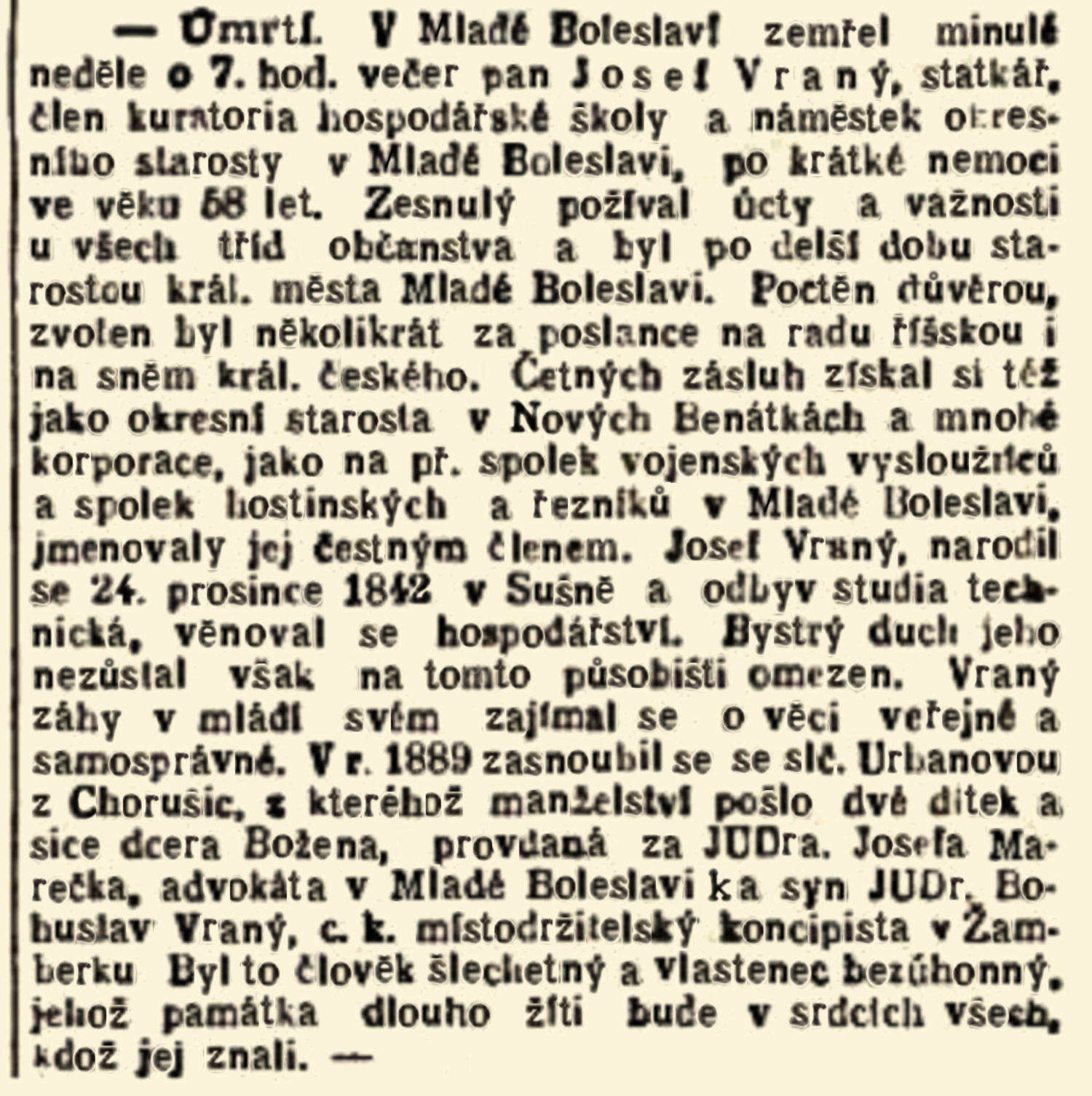 * 28.12.1842 † 13.10.1901 * 24.(28.) 6.12.1842 † 13.10.1901 (1887?)| Rodiče: | Václav Vraný * 15.6.1808 † 14.4.1877 statkář v Sušně č. 18 Marie Horáková Vraná * 20.11.1815 † 20.3.1898 |