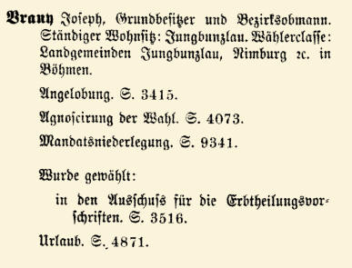 | Vraný, Josef geb. 28.12.1842 Suschno/Sušno (heute Gemeinde Kropáčova Vrutice), Bezirk Jungbunzlau/Mladá Boleslav gest. 13.10.1901 Jungbunzlau/Mladá Boleslav, Böhmen röm.-kath. Vater: Václav V. († 1877), Landwirt verh. 1869 Anna Urbanová, 2 Töchter, 1 Sohn 1848-1853 Volksschule in Suschno und Choruschitz/Chorušice (Bezirk Melnik/Mělník, Böhmen); Realschule in Böhmisch Leipa/Česká Lípa (Böhmen) und Wien; Studium Chemie Technische Hochschule Wien und Agronomie Universität Halle (Provinz Sachsen, Preußen; heute Sachsen-Anhalt) Gutsbesitzer in Choruschitz und Besitzer des Familienhofs in Suschno (1870 Verpachtung); 1884 Kauf des Haslerhof/Hasleruv dvůr in Jungbunzlau, Kauf weiterer Bauerngüter um Jungbunzlau 1883-1889 böhmischer Landtag; Obmann der Bezirksvertretung Neubenatek/Nové Benátky (heute Benátky nad Jizerou, Bezirk Junbunzlau); bis 1897 Bürgermeister von Jungbunzlau Mitglied des Abgeordnetenhauses 1886-1888 VII. Legislaturperiode 29.09.1886-14.06.1888 (Nachwahl nach Tod von Josef Klima; Rücktritt) Böhmen, Landgemeinden 12 Jungbunzlau, Benatek, Nimburg, Turnau, Münchengrätz, Liban, Sobotka Klubmitgliedschaft: Český club (Böhmischer Klub) [Národní strana - Alttscheche] Lit.: Lišková; Beneš, Osobnosti Mladoboleslavska; Mladoboleslavské listy v. 16.10.1901 |