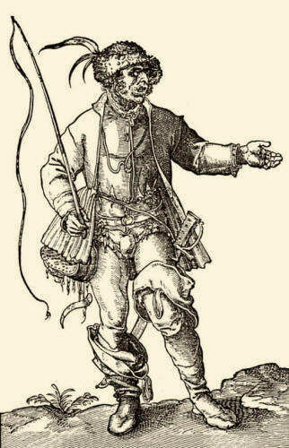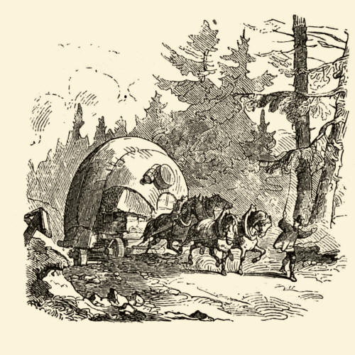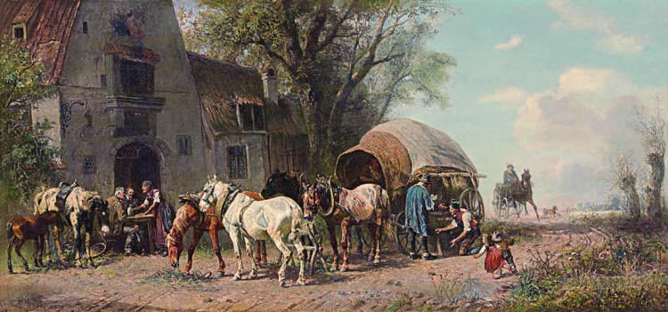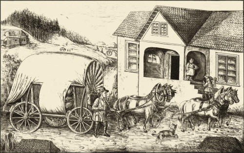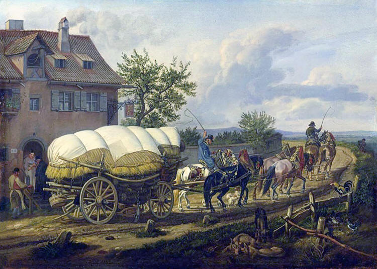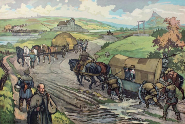 | Dva protijedoucí povozy se míjejí. Jeden je nákladní, druhý osobní. Forman vlevo má modrý kabát. Oba jsou doprovázeny ozbrojeným doprovodem, osobní povoz řídí ozbrojenec a doprovází jej dokonce jeden jezdec. Místo, kde je mokřina, je částečně vyspraveno dřevem. Ozbrojenci pomáhají, je-li vůz v bahně. Oba povozy mají široká kola podle předpisu. Vedle cesty je ještě pěšina pro poutníky a vandrovníky. V dáli u cesty je u mostu tvrz - částečně opevněná zemědělská usedlost. Vpravo od cesty je kamenný kříž. |