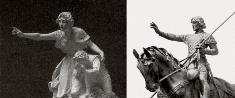 Bohuslav Schnirch provedl v roce 1900 sochařskou výzdobu na Pražské městské pojišťovně dvěma sochami s názvem Volání o pomoc a Hašení! Jsou to jeho poslední provedené práce. Nesporně při tom vycházel z vlastních zkušeností jednak z požáru, který zažil v Římě, jednak ze zkušenosti při požáru Národního divadla, kdy marně volali o pomoc a kdy patrně kvůli chybným rozhodnutím přestala stříkat voda. První socha zachycuje okamžik, kdy dívka zosobňující Národní divadlo navzdory požáru se starostlivým výrazem v tváři žehná pravou rukou českému národu gestem ruky podobným tomu, jakým žehnal národu Schnirchův svatý Václav. Levou rukou chrání chlapce vedle sebe. Volající chlapec je personifikací samotného Schnircha a těch, kdo pro Divadlo pracovali. Volá se střechy o pomoc v podobě vody, ale symbolicky vlastně volá po duchovní obnovující síle. To při požáru Národního divadla Bohuslav zažil doslova na ‚vlastní kůži‘ . Dvojice jakoby byla parafrází postavy Čechie chránící své děti na přední straně zamýšleného soklu sochy svatého Václava. Druhá socha znázorňuje hasiče, který k požáru dorazil pozdě a drží v ruce mrtvou postavu téže dívky, znázorňující vyhořelé Divadlo. Podobně, jako svatý Václav, drží svou ‚zbraň‘ v levé ruce. Jakoby se podle výrazu tváře tázal: k čemu je obyčejná voda, když chybí požehnání? Odkazuje tak ke stejné duchovní síle a k pravdě, která vysvobozuje, na kterou poukazoval Schnirch sochou svatého Václava s modlitbou, která měla být na soklu sochy: